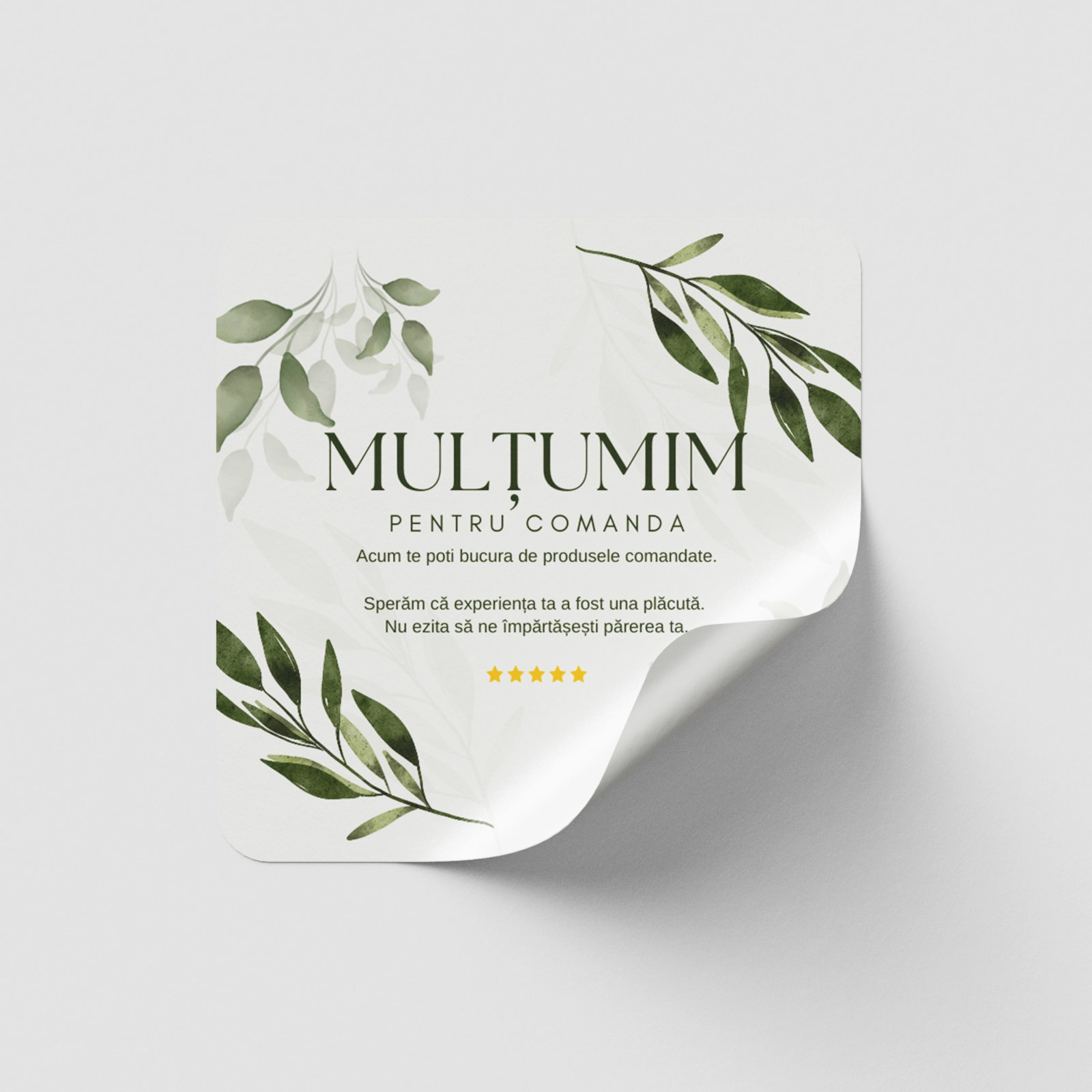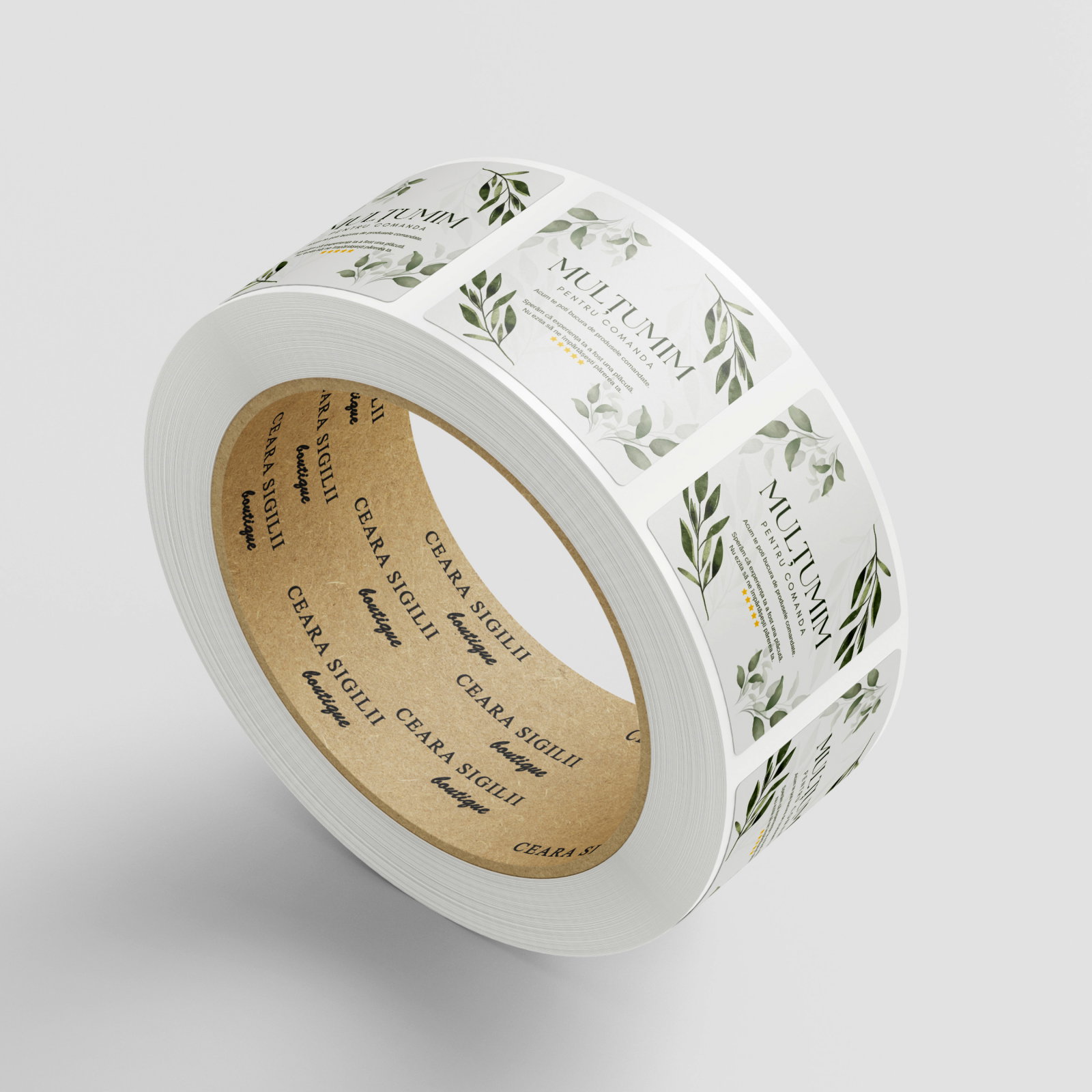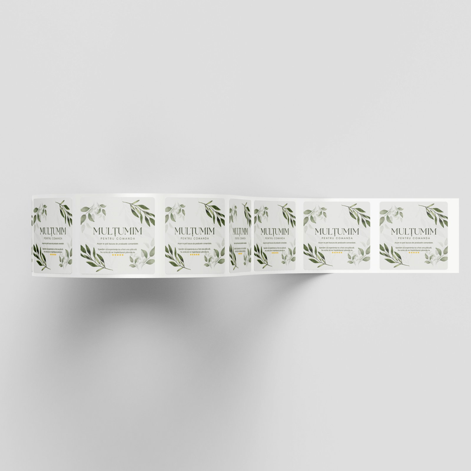 Etichete in rola cu mesajul Multumim pentru comanda si design cu frunzulite verzi